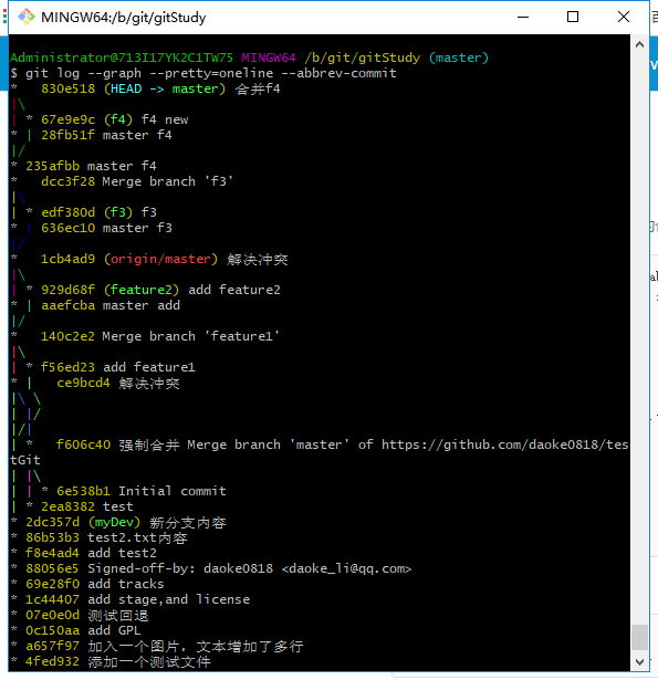 其中 <<<<<<< HEAD 和 ======= 之间是当前分支的最新版, ======= 和 >>>>>>> f4 之间是目标分支内容,手动修改后删掉这些符号,然后提交,结构如图: